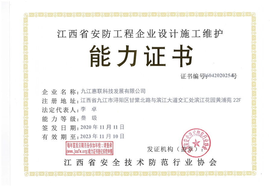 首页 >> 榮譽(yù)資質(zhì) >>資質(zhì)證書 >> 安防工程企業(yè)設(shè)計(jì)施工維護(hù)能力證書